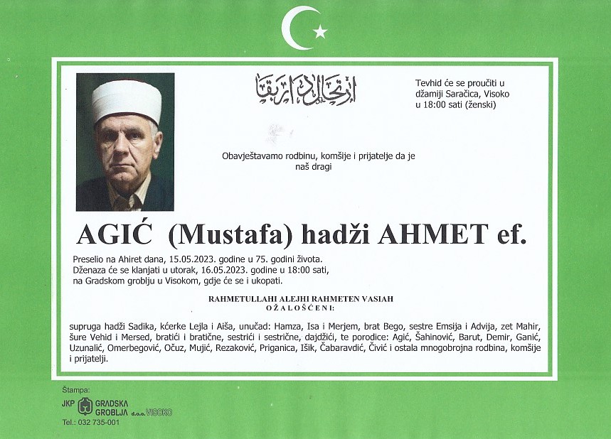 AGIĆ (Mustafa) hadži AHMET ef. 16.05.2023. godine u 18:00 sati 15. Maja 2023. AGIĆ (Mustafa) hadži AHMET ef. 16.05.2023. godine u 18:00 sati