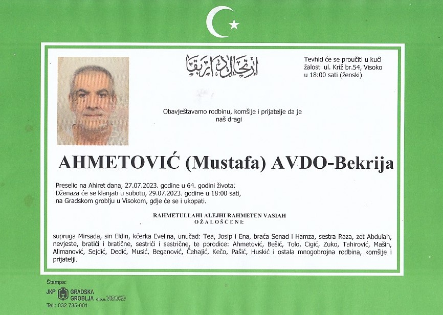 AHMETOVIĆ (Mustafa) AVDO 29.07.2023. godine u 18:00 sati 27. Jula 2023. AHMETOVIĆ (Mustafa) AVDO 29.07.2023. godine u 18:00 sati