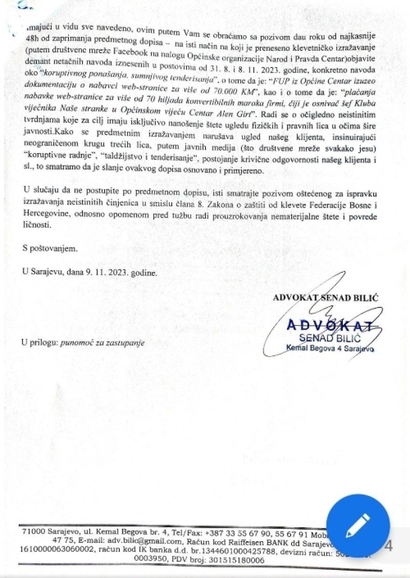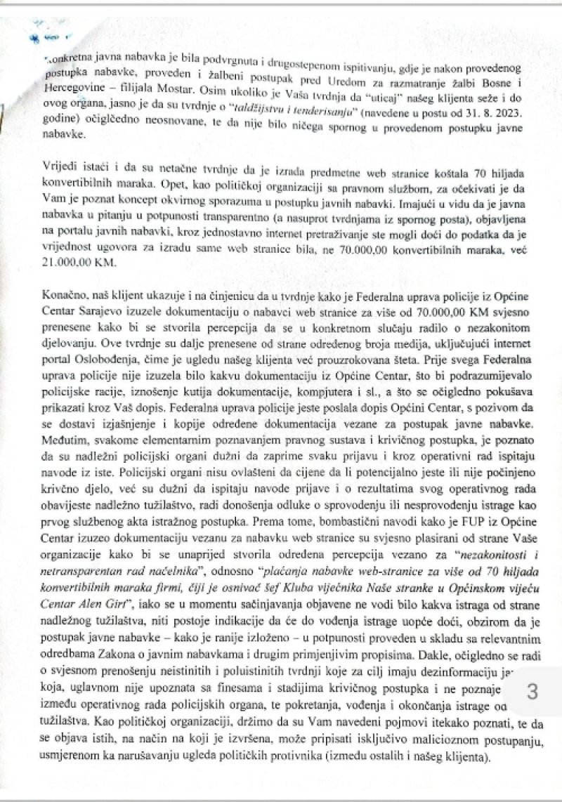 U vezi sa jučerašnjim saopštenjem NiP-a Centar u kojem se dovodim u vezu sa navodnim nezakonitostima prilikom izrade web-stranice općine Centar, zbog ličnog digniteta i istinitog informisanja javnosti, dužan sam saopštiti sljedeće: