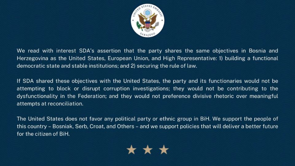Američka Ambasada u Bosni i Hercegovini kritikovala je Stranku demokratske akcije (SDA), navodeći da bi, ako zaista dijeli ciljeve sa Sjedinjenim Američkim Državama (SAD), ona i njeni funkcioneri ne bi pokušavali blokirati i ometati istrage o korupciji.