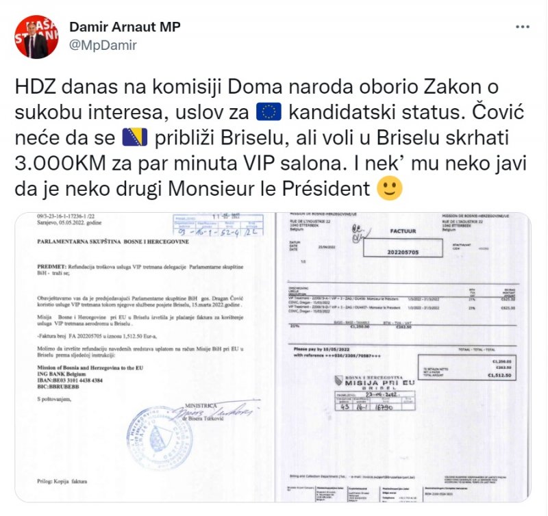 “HDZ danas na komisiji Doma naroda oborio Zakon o sukobu interesa, uslov za kandidatski status. Čović neće da se BiH približi Briselu, ali voli u Briselu skrhati 3.000KM za par minuta VIP salona”, napisao je Arnaut, podijelivši pri tome dokumente koji prikazuju troškove boravka Dragana Čovića u Briselu u martu, prilikom čega je za VIP tretman na aerodromu izdvojeno više od 1,500 eura.