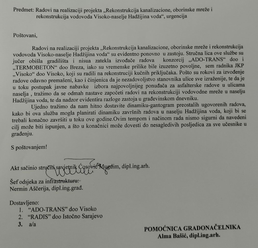 Služba za infrastrukturu, ekologiju, komunalne i inspekcijske poslove. Radovi na realizaciji projekta “Rekonstrukcija kanalizacione, oborinske mreže i rekonstrukcija vodovoda Visoko-naselje Hadžijina voda”. URGENCIJA...