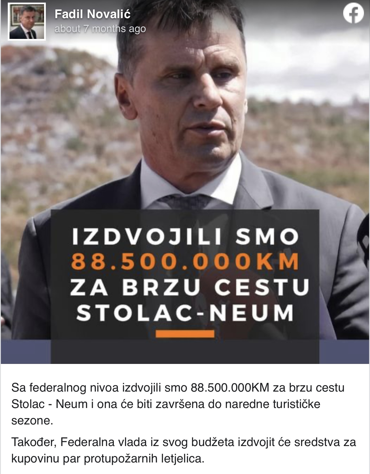 Fadil Novalić, premijer Federacije BiH, objavio je na svom Facebook profilu u septembru prošle godine da će Federalna vlada iz svog budžeta izdvojiti...