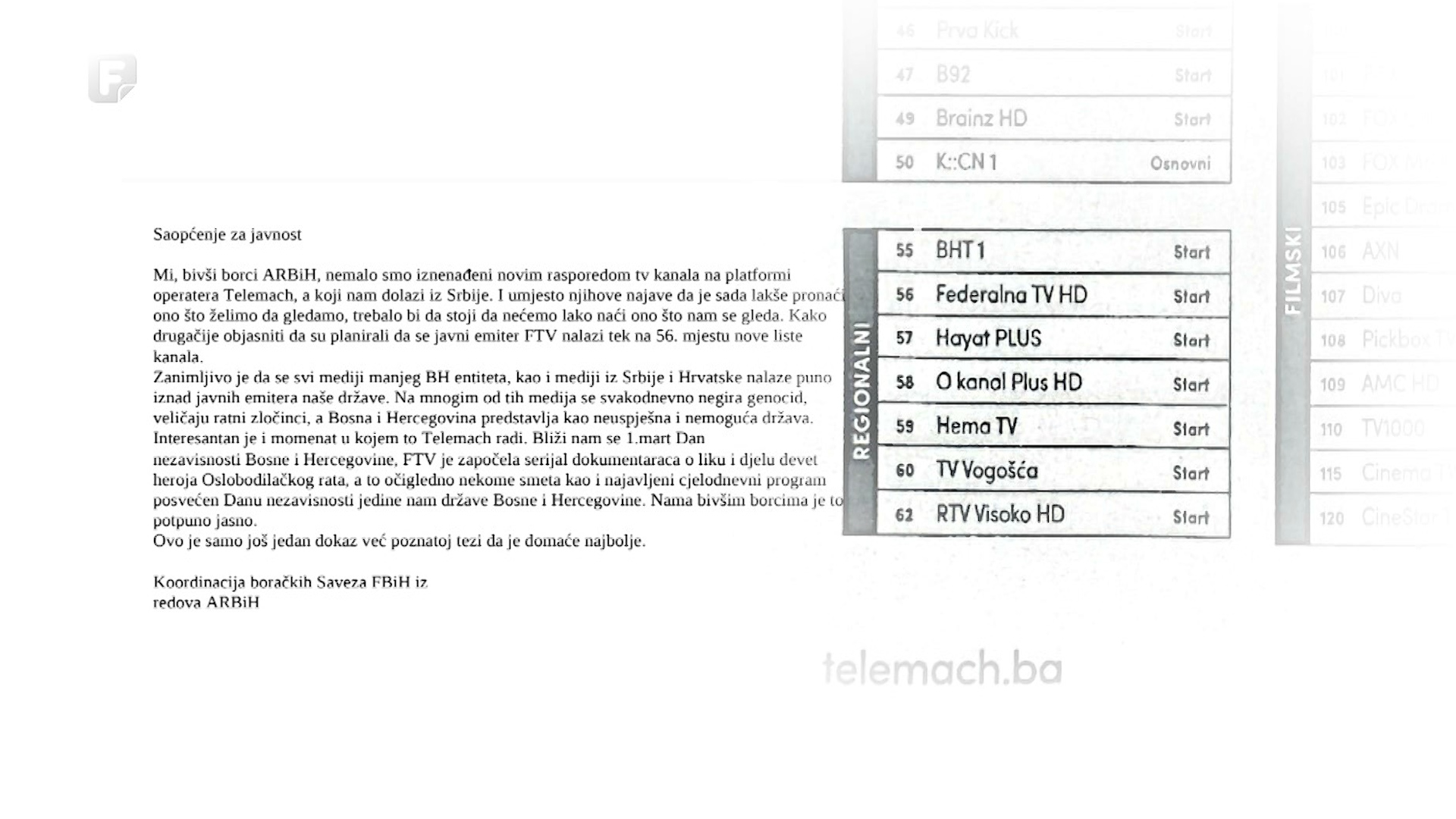 Koordinacija boračkih saveza Federacije Bosne i Hercegovine iz redova Armije Republike Bosne i Hercegovine uputila je saopćenje za javnost povodom repozicioniranja Federalne televizije...