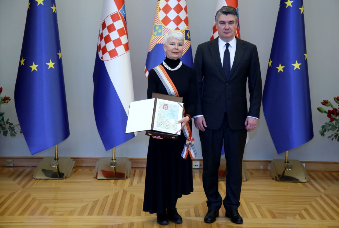 Na 10. obljetnicu potpisivanja pristupnog ugovora Hrvatske Europskoj uniji, predsjednik Zoran Milanović odlikovao je bivšu premijerku Jadranku Kosor Veleredom kraljice Jelene s lentom...