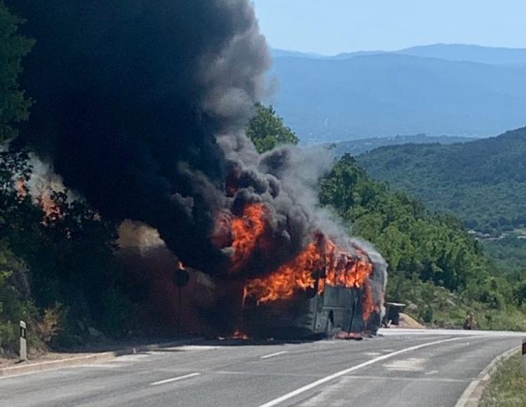 Autobus koji je prevozio učenike iz Širokog Brijega na ekskurziju u Hrvatsku, zapalio se tokom vožnje na cesti D-76 kod Imotskog.
