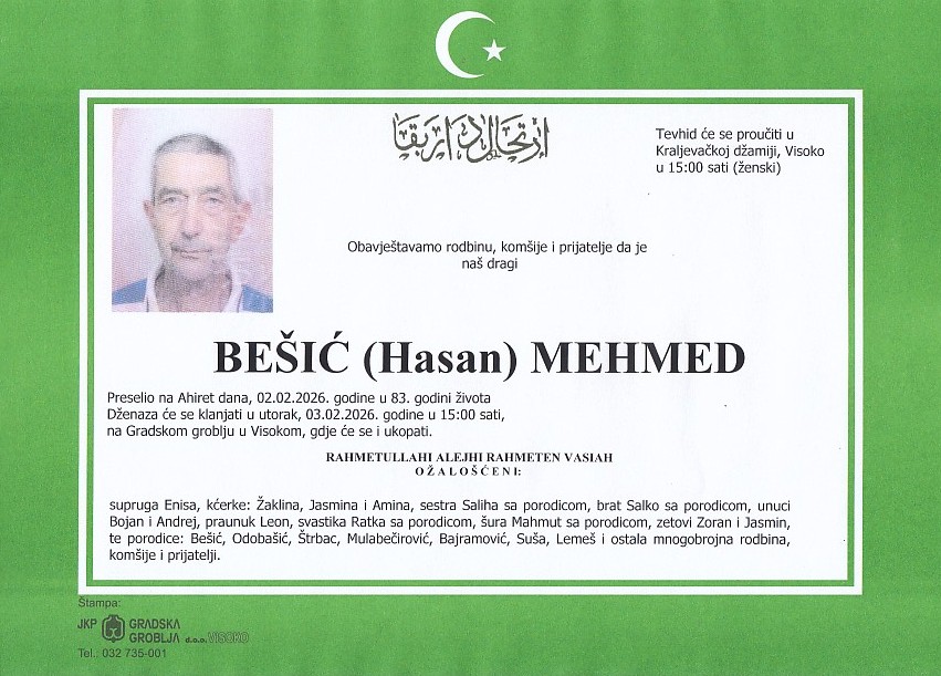BEŠIĆ (Hasan) MEHMED 03.02.2026. u 15:00 sati