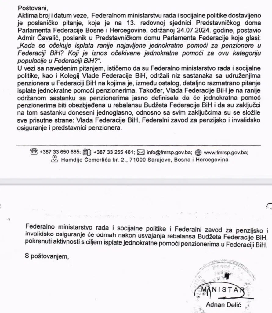 Federalno ministarstvo rada i socijalne politike će, kaže Delić, odmah nakon rebalansa budžeta, pristupiti isplati jednokratne pomoći.