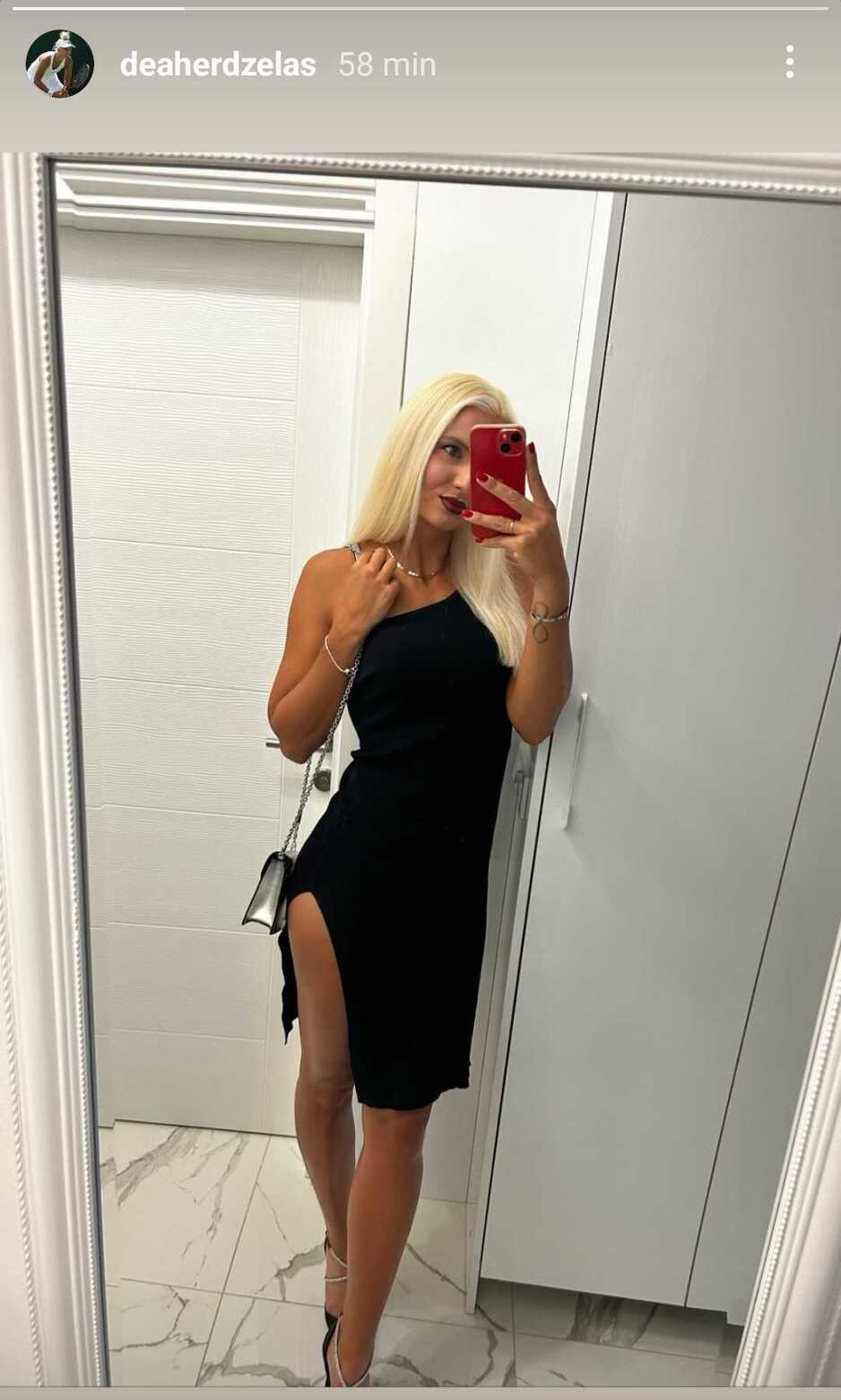 U pripijenoj kratkoj crnoj haljini s prorezom na jednoj strani i sandalama visokih potpetica, Herdželaš je pozirala ispred velikog ogledala. Svoju modnu kombinaciju upotpunila je jednostavnom šminkom i srebrenim nakitom.