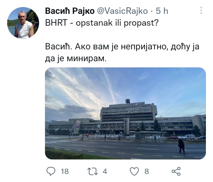Rajko Vasić, član Glavnog odbora SNSD-a i bivši izvršni sekretar stranke, objavio je na Twitteru sramotnu poruku posvetivši je situaciji na Radioteleviziji BiH (BHRT).