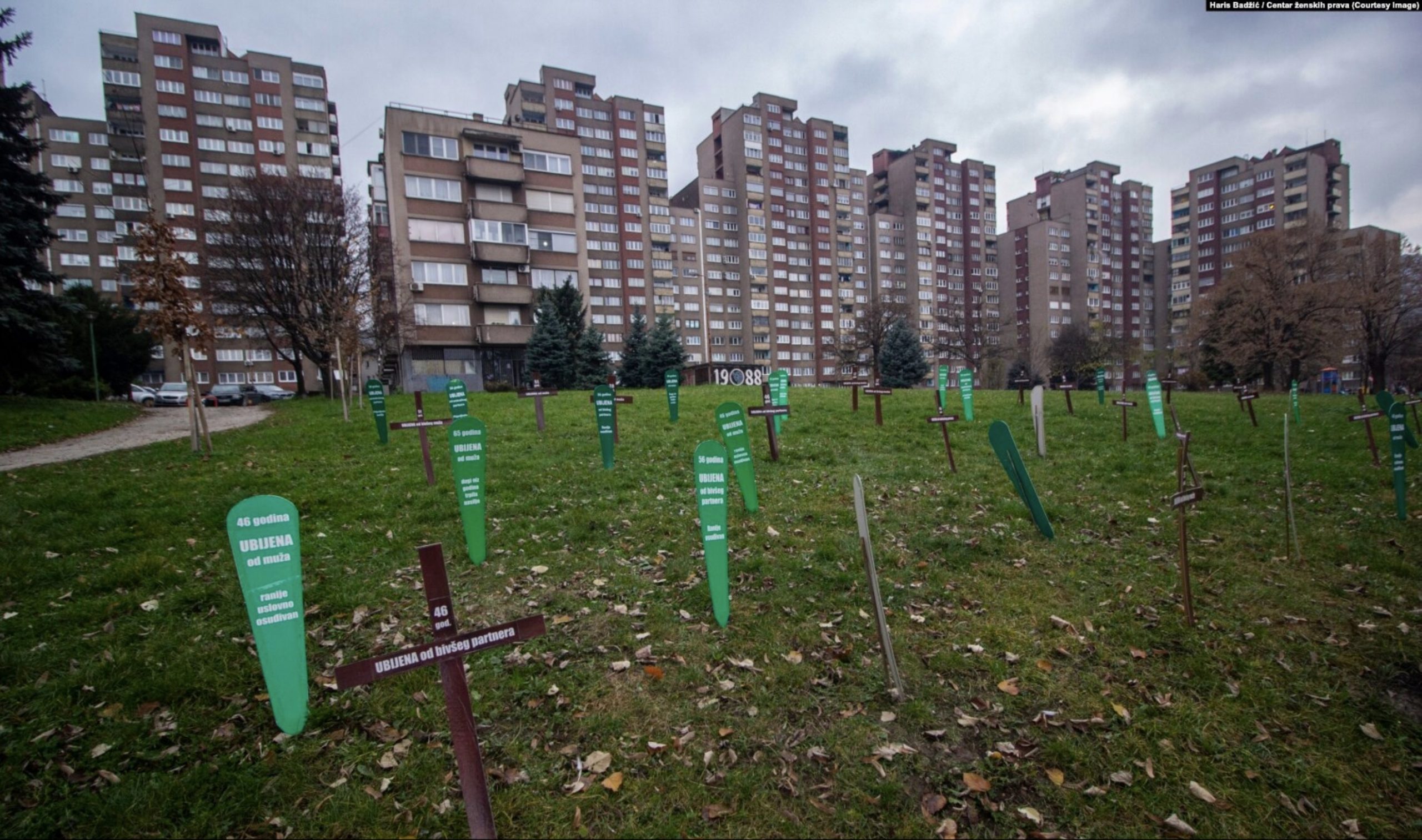 Na bašlucima i krstovima koji simboliziraju te mrtve žene, ubijene žene stoje njihova godišta i ko ih je ubio. U centru Zenice aktivistice...