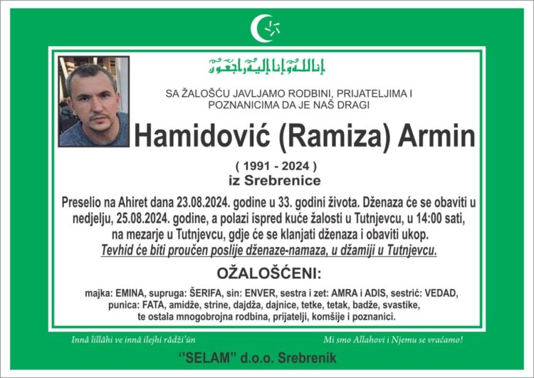 rmin Hamidović, porijeklom iz Srebrenice preminuo je u 33. godini života nakon borbe sa teškom bolešću. Iza Armina su ostali majka, supruga, sin...