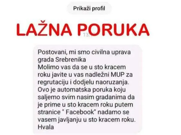 Građani Srebrenika već dva dana dobijaju poruke putem Facebooka da se jave u MUP zbog mobilizacije i zaduživanja naoružanja. Poruka dolazi sa lažne...