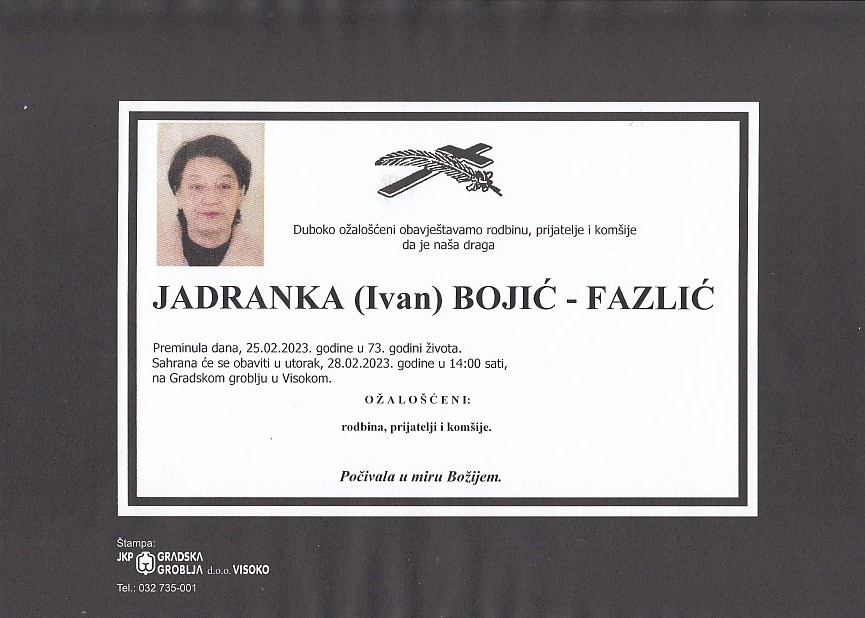 BOJIĆ-FAZLIĆ (Ivan) JADRANKA 28.02.2023. godine u 14:00 sati 27. Februara 2023. BOJIĆ-FAZLIĆ (Ivan) JADRANKA 28.02.2023. godine u 14:00 sati
