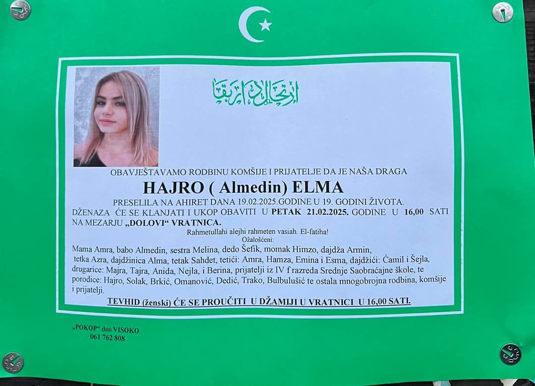 “Pupoljak ruže ne procvjetale… Hurijo Dzennetska”, “U Džennetu nam mirisala. Dok živim, živjet ćeš i ti. Pola mog srca ode.. Bolu vječni, ljubavi vječna volim te”, poruke su kojom su se Elmi bliski ljudi oprostili od ove mlade djevojke čiji je život prerano i tragično okončan.
