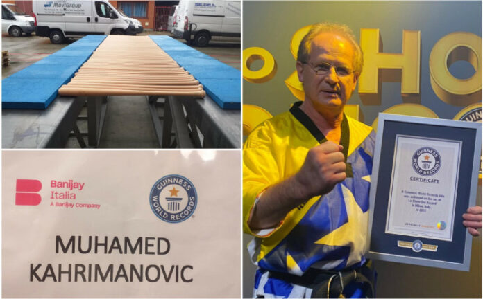 Bosanac Muhamed Kahrimanović, vlasnik 12 Ginisovih rekorda u disciplinama koje traže snagu, preciznost i vještinu, večeras je oborio još jedan Ginisov rekord.
