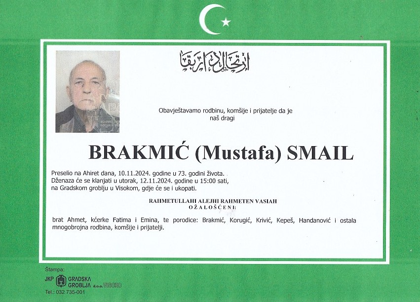 BRAKMIĆ (Mustafa) SMAIL 12.11.2024. godine u 15:00 sati 11. Novembra 2024. BRAKMIĆ (Mustafa) SMAIL 12.11.2024. godine u 15:00 sati