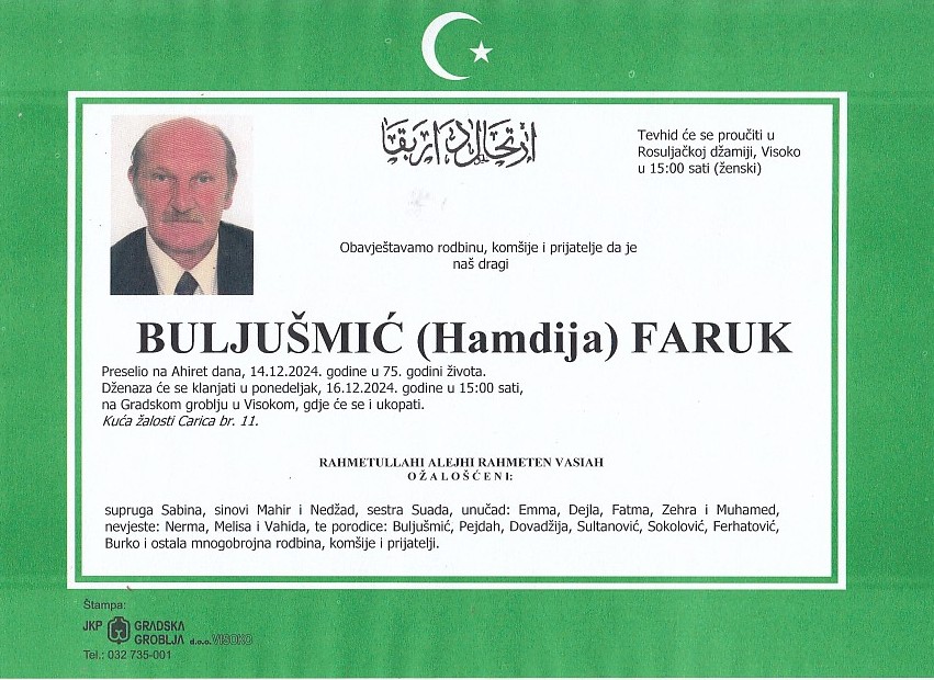 BULJUŠMIĆ (Hamdija) FARUK 16.12.2024. godine u 15:00 sati 14. Decembra 2024.14. Decembra 2024. BULJUŠMIĆ (Hamdija) FARUK 16.12.2024. godine u 15:00 sati