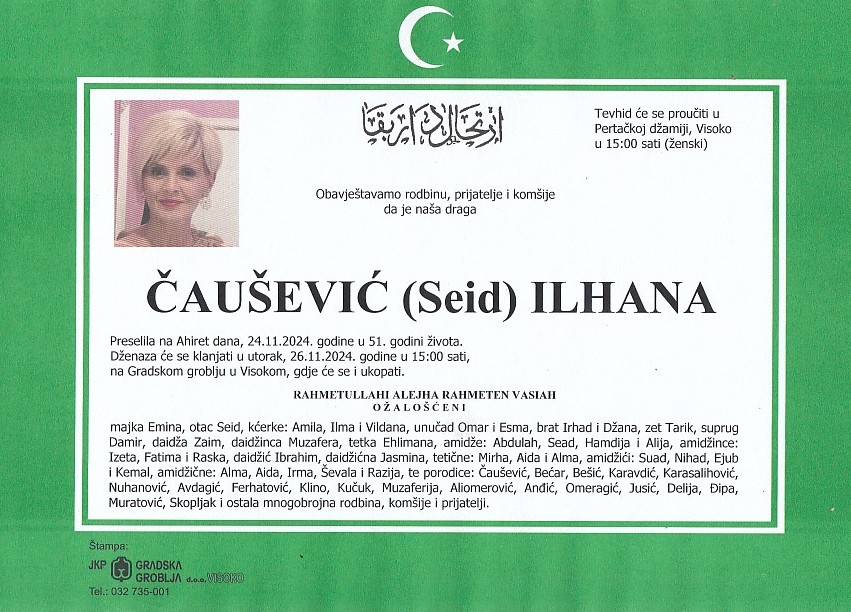 ČAUŠEVIĆ (Seid) ILHANA 26.11.2024. godine u 15:00 sati 25. Novembra 2024. ČAUŠEVIĆ (Seid) ILHANA 26.11.2024. godine u 15:00 sati