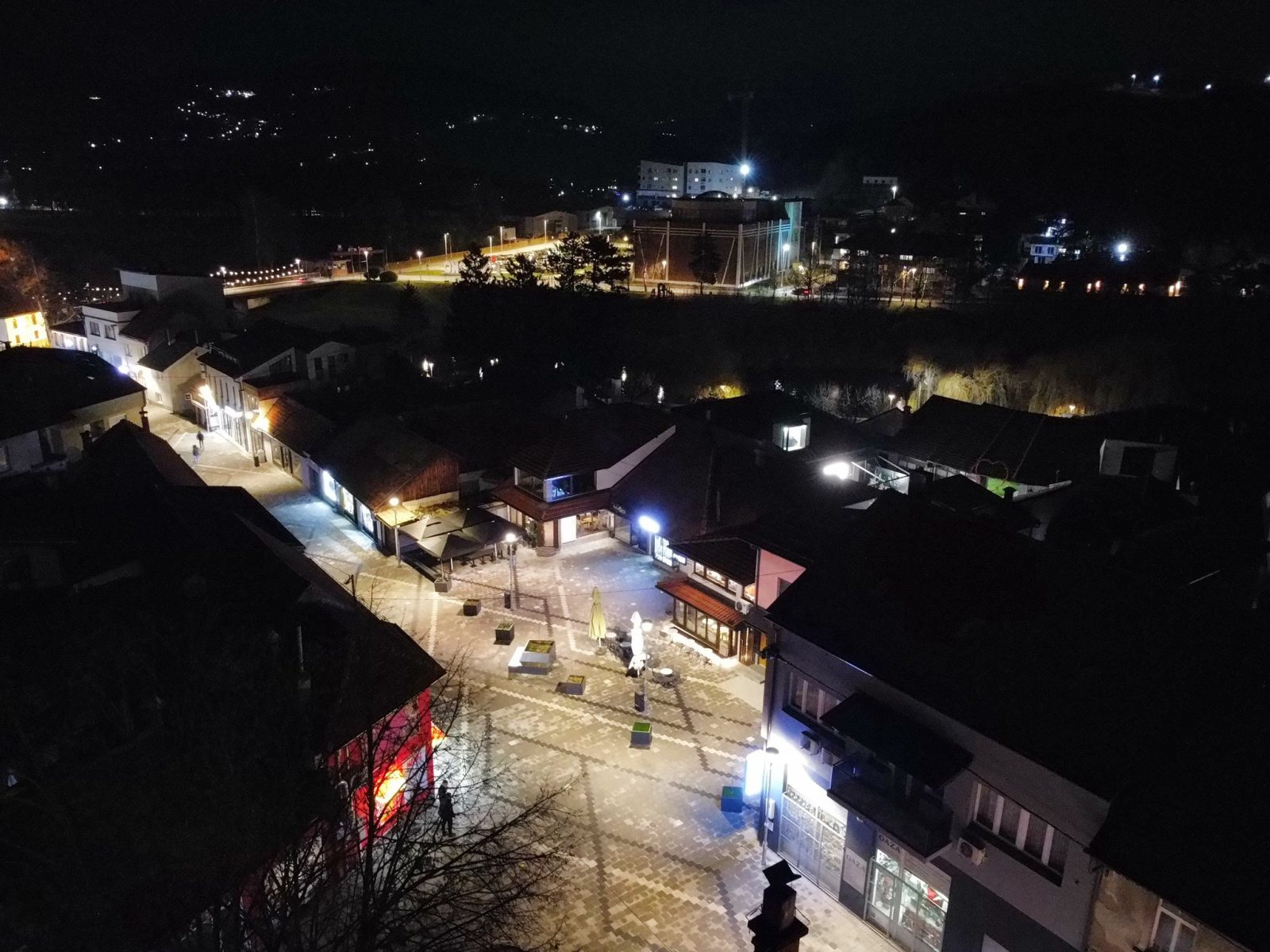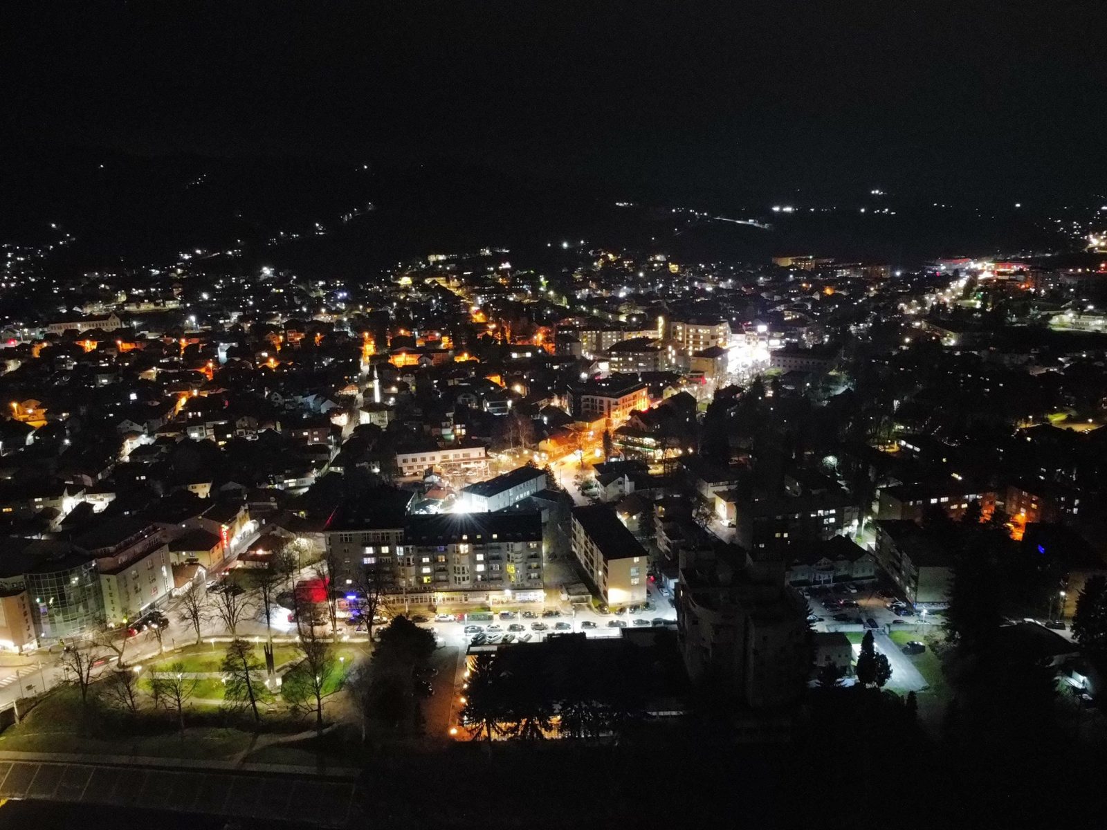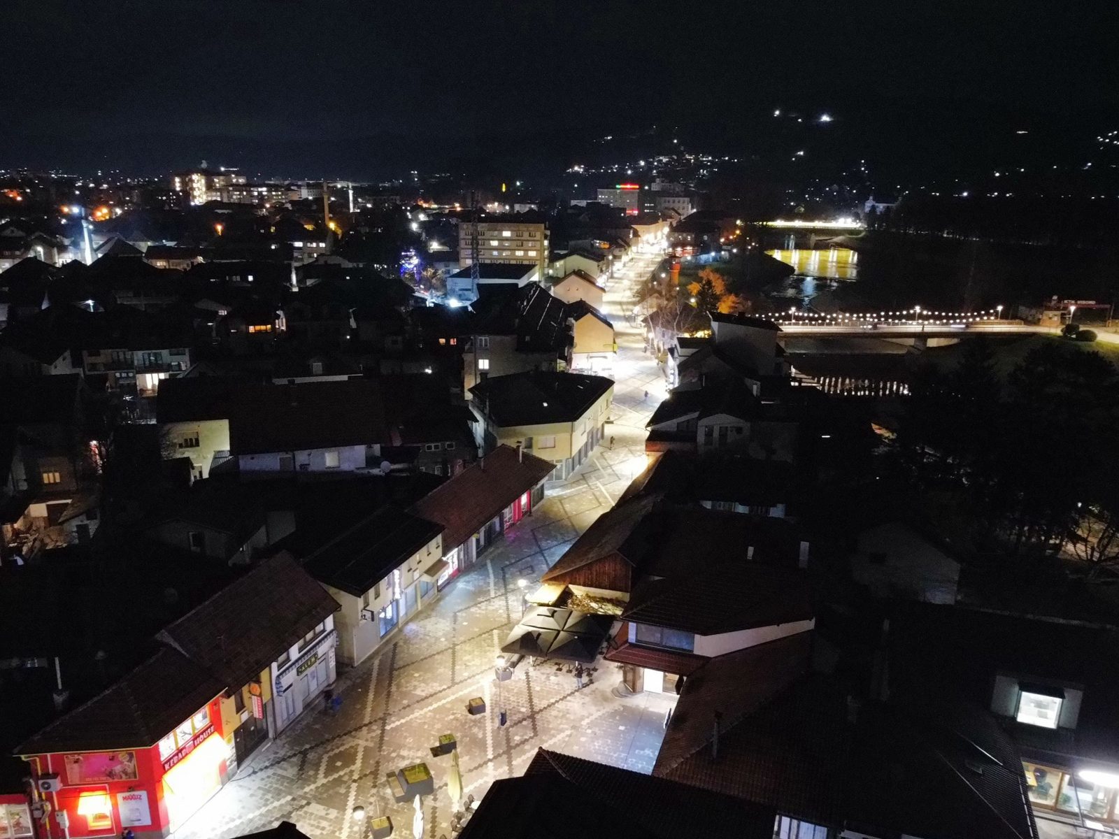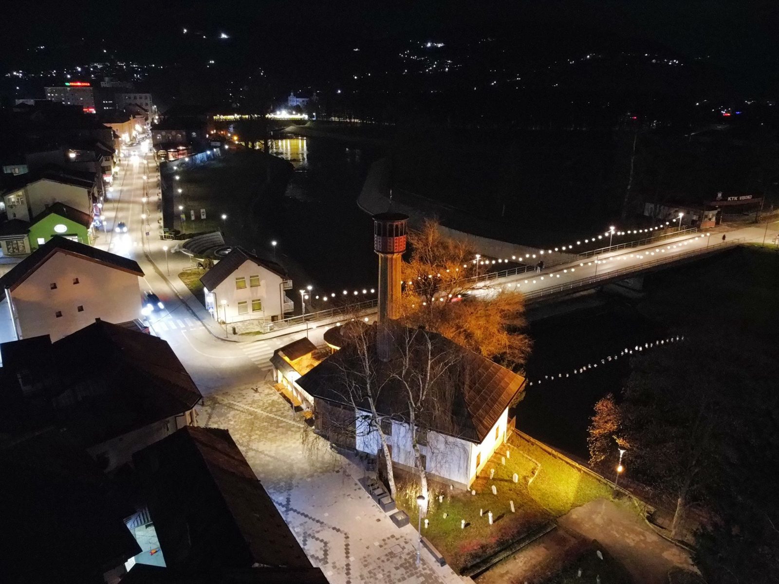 Centar Visokog u noći 25. decembra 2025. godine zabilježen je kroz objektiv drona, donoseći jedinstvene kadrove praznične atmosfere grada. Osvijetljene ulice, trg i gradske tačke pružaju poseban noćni ugođaj.