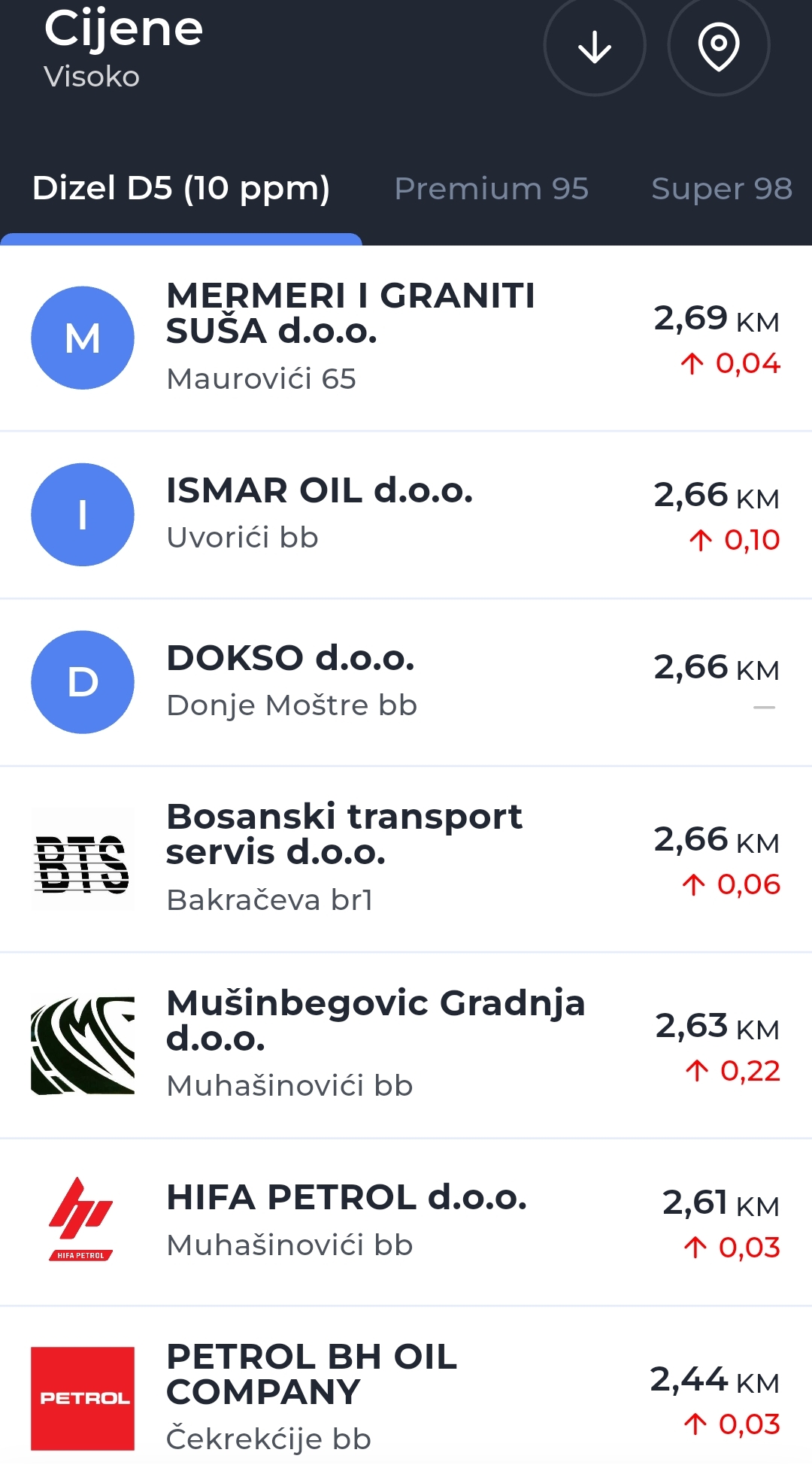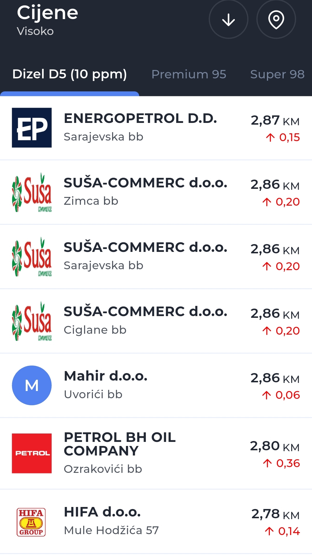 U Visokom i njegovoj okolici, u porastu su cijene dizela, benzina i plina, što je vidljivo i putem aplikacije Federalnog ministarstva trgovine FBiH Oil info.