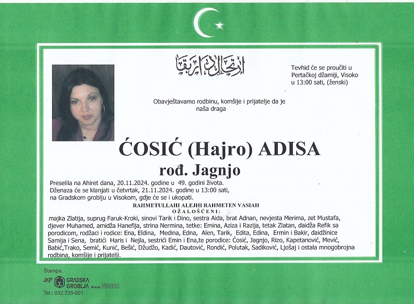 ĆOSIĆ (Hajro) ADISA 21.11.2024. godine u 13:00 sati 20. Novembra 2024. ĆOSIĆ (Hajro) ADISA 21.11.2024. godine u 13:00 sati