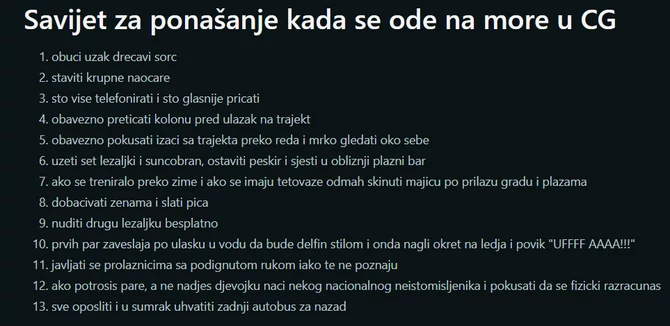 Rijetki su oni s našeg podneblja koji još uvijek za ljetovanje nisu birali neku od crnogorskih destinacija Budvu, Sutomore, Kotor ili Herceg Novi. Jedan korisnik Redita odlučio je da sažme najčešće modele ponašanja muškaraca i da mladim naraštajima uputi, ironično, savjete kako da se ponašaju kada dođu na ljetovanje.