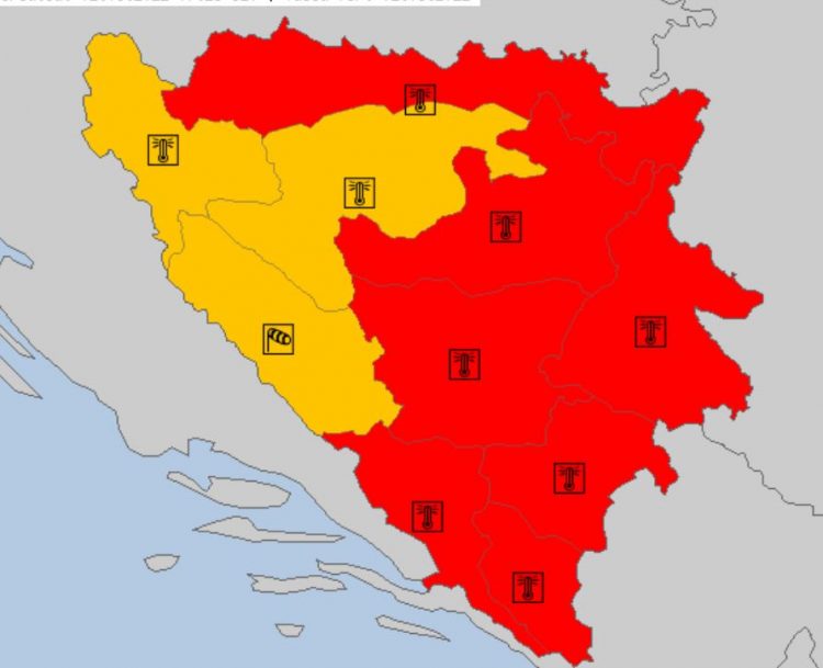 Crveni meteoalarm upaljen je za veći dio Bosne i Hercegovine. Prema podacima Federalnog hidrometeorološkog zavoda, temperature će se kretati do 40 stepeni.