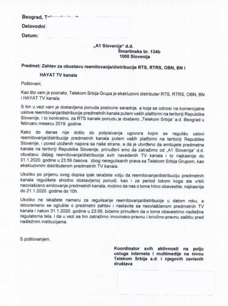 No, Raport je sad u posjedu dopisa kojeg je TS slao slovenskom operateru A1. U njemu Telekom Srbije prvo navodi da je ekskluzivni vlasnik prava, između istalog i Hayata, a onda prelazi na problem.