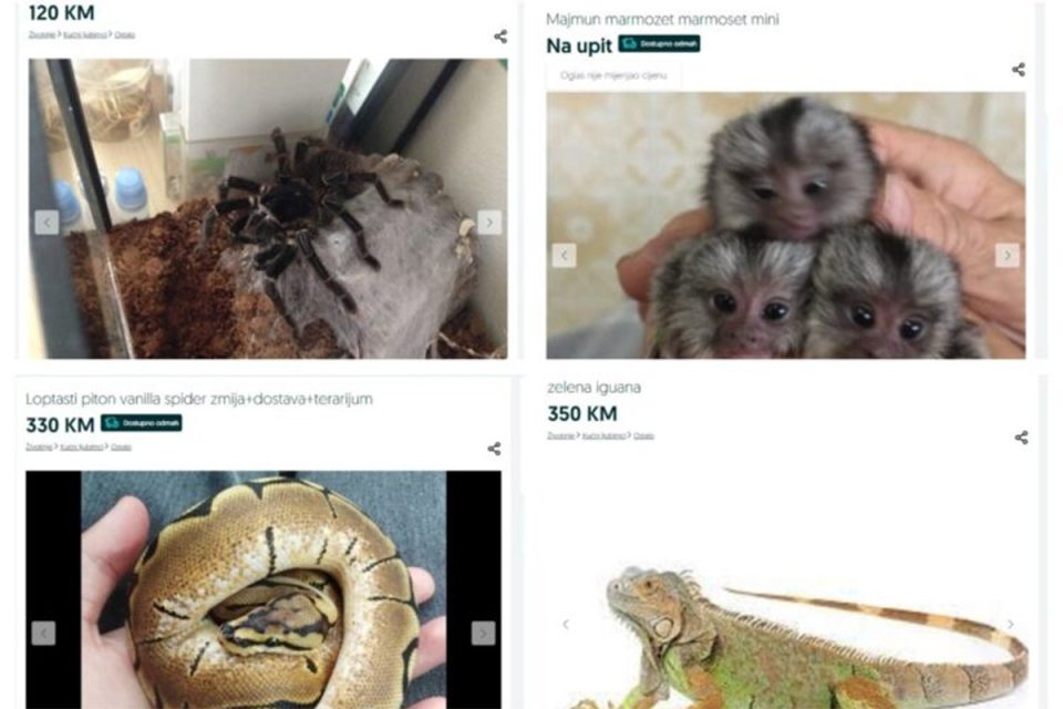 Na jednoj od najpopularnijoj oglasnih stranica za prodaju na internetu olx.ba, moguće je pronaći pitona za 350 KM, tarantule od 30 KM do 150 KM, iguanu za 350 KM, a tu su i majmuni, čija je cijena na upit.