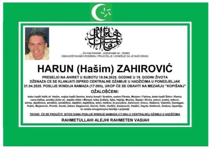 Načelnik Općine Hadžići, Eldar Čomor, proglasio je ponedjeljak, 21. april 2025. godine, Danom žalosti na području općine Hadžići zbog pogibije sugrađanina, 19-godišnjeg Haruna Zahirovića, u saobraćajnoj nesreći koja se dogodila u subotu, 19. aprila, na magistralnom putu M-17, u mjestu Osenik.