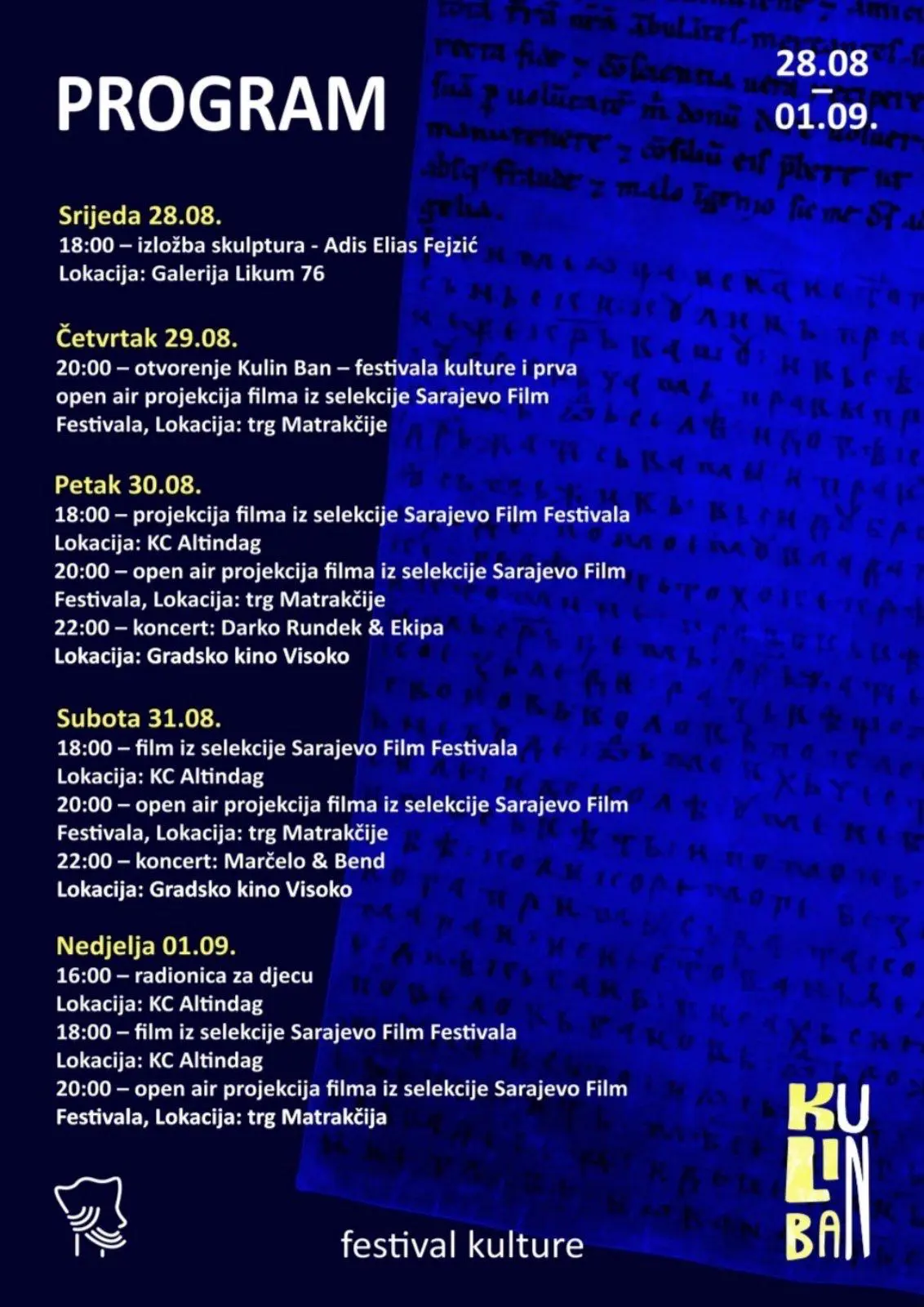 Kulin Ban festival kulture, održat će se u Visokom od 28. augusta do 1. septembra. Festival je organizovan od strane nevladinog udruženja “SETUP”.