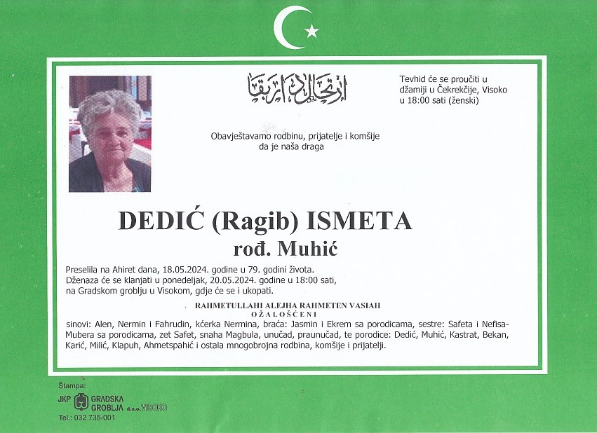 DEDIĆ (Ragib) ISMETA 20.05.2024. godine u 18:00 sati 20. Maja 2024. DEDIĆ (Ragib) ISMETA 20.05.2024. godine u 18:00 sati