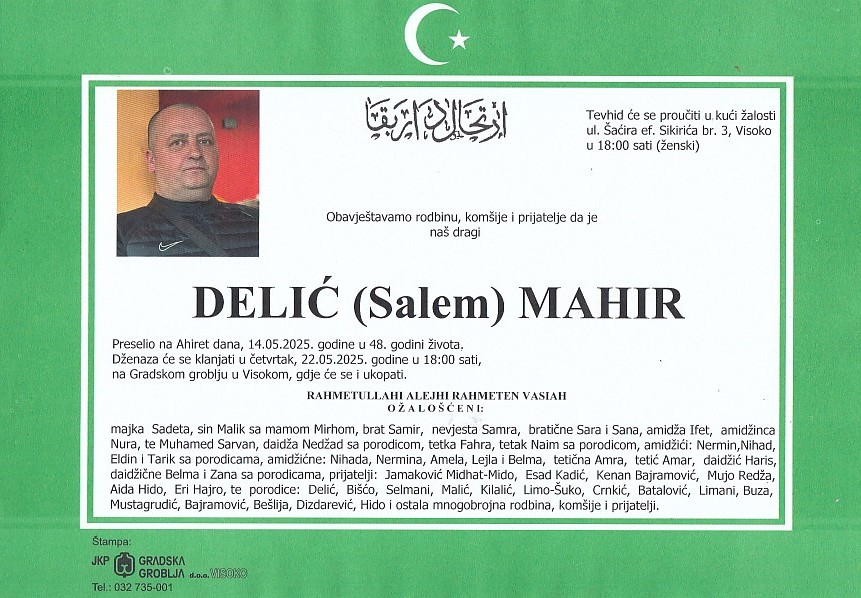 DELIĆ (Salem) MAHIR 22.05.2025. godine u 18:00 sati 21. Maja 2025.21. Maja 2025. DELIĆ (Salem) MAHIR 22.05.2025. godine u 18:00 sati