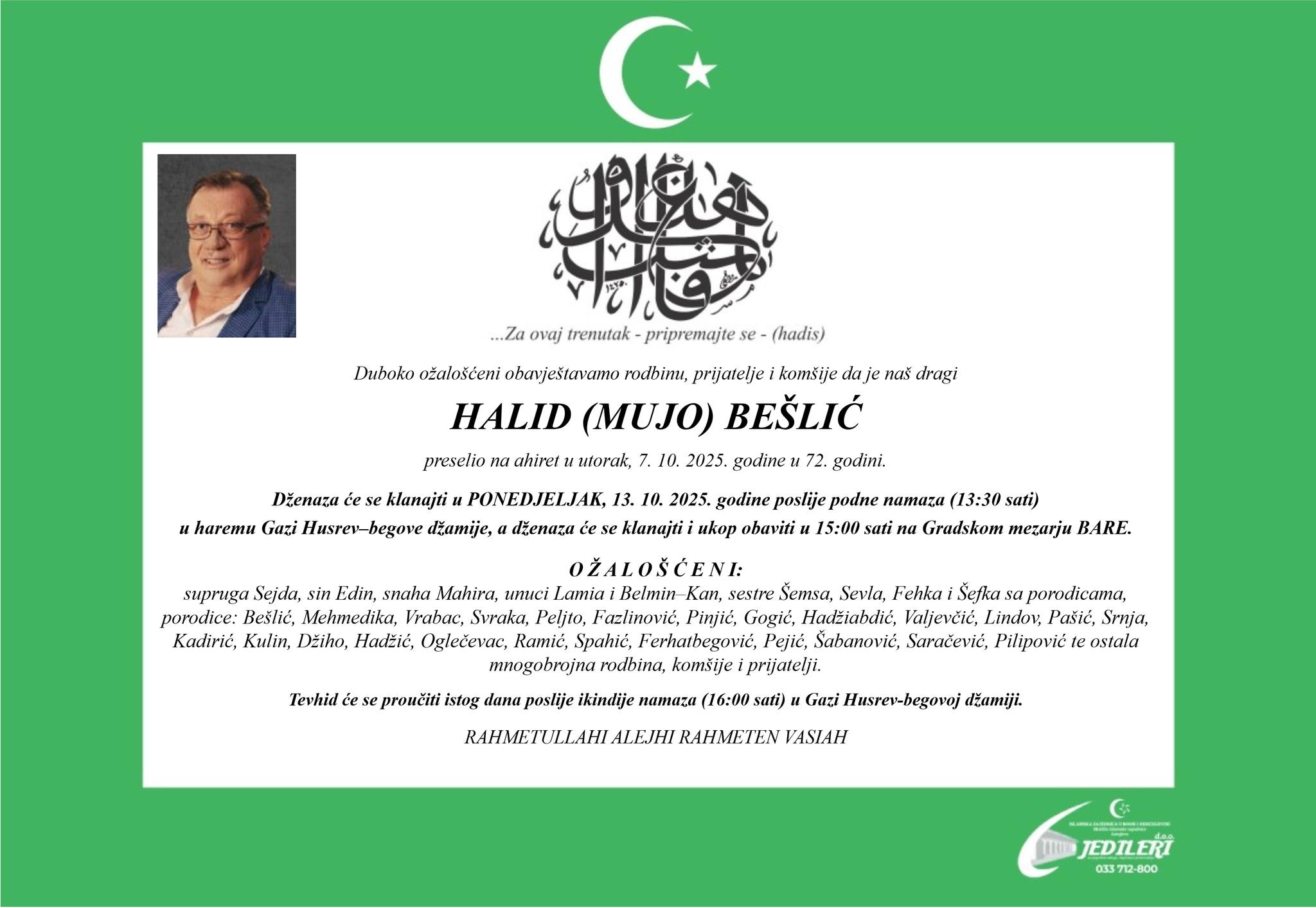 Dženaza-namaz Halida Bešlića klanjat će se u ponedjeljak, 13. oktobra, poslije podne namaza (u 13:30 sati) u haremu Gazi Husrev-begove džamije u Sarajevu, a ukop će se obaviti u 15 sati na Gradskom mezarju Bare.