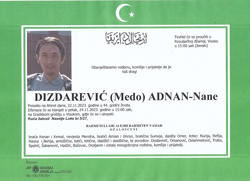 DIZDAREVIĆ (Medo) ADNAN 24.11.2023. godine u 15:00 sati 22. Novembra 2023. DIZDAREVIĆ (Medo) ADNAN 24.11.2023. godine u 15:00 sati