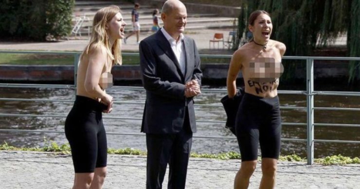Dvije djevojke danas su u znak protesta zbog rasta troškova života tokom susreta sa njemačkim kancelarom Olafom Scholzom u Berlinu skinule gornji dio odjeće kako bi pokazale parole ispisane po tijelu.