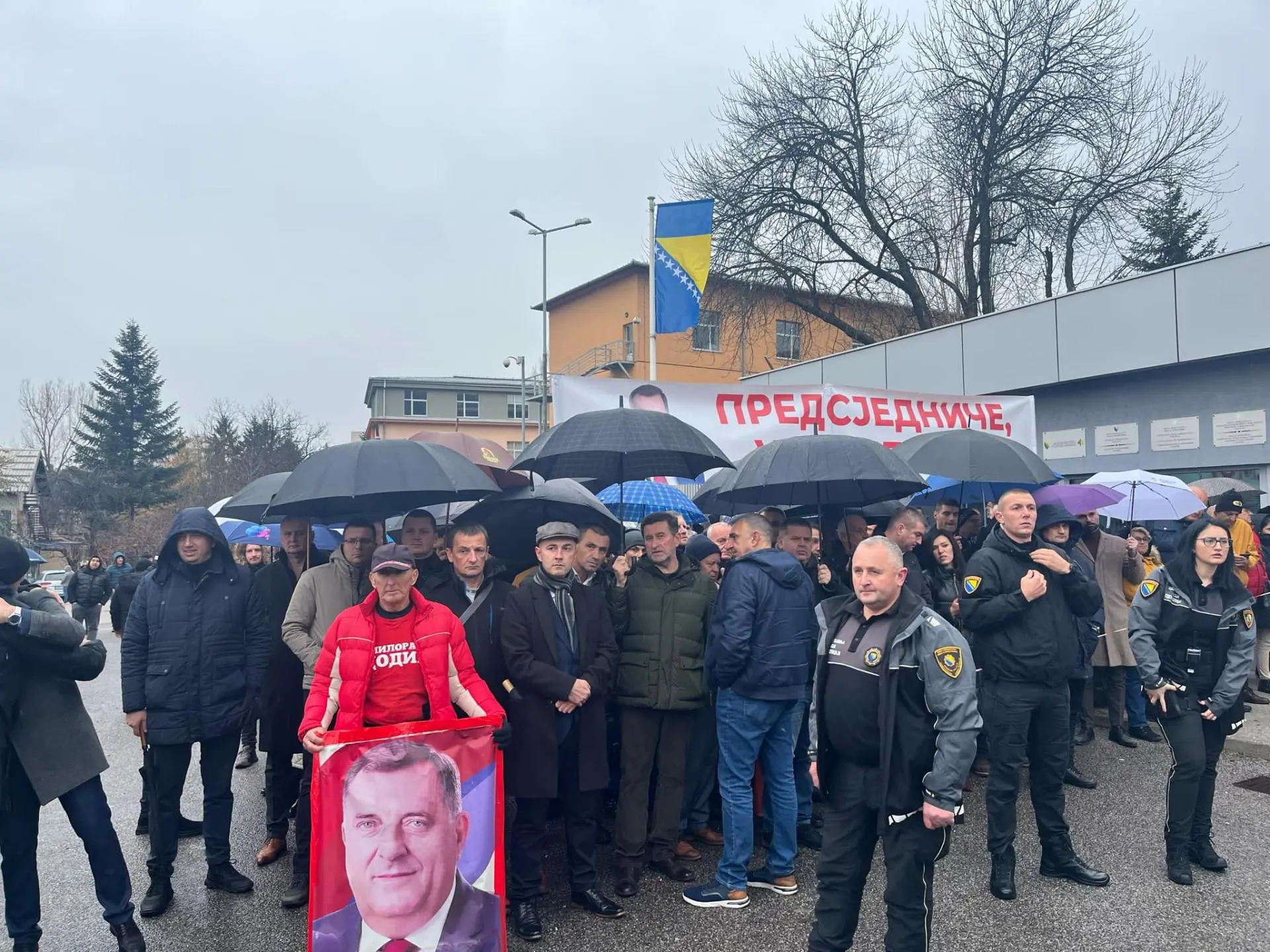 Ispred Suda je, kao i ranije, transparent na kojem piše: “Predsjedniče, uz tebe smo”, a tu su fotografije lidera SNSD-a i predsjednika RS-a.