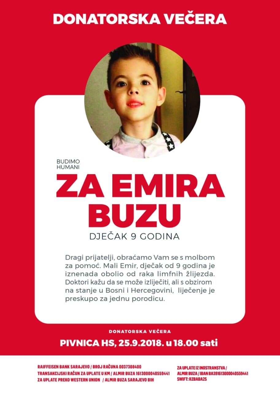 Donatorska večera za malog Emira Buzu, inače sina velikog umjetnika i estradnog radnika, bit će održana 25. septembra u Pivnici HS u Sarajevu u 18.00 sati, saopćeno je iz Hayat production.