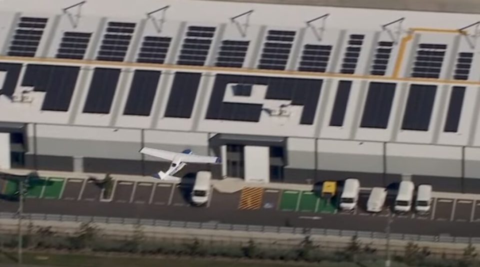 Snimak iz helikoptera prikazuje kako letjelica gubi na visini, a čini se da za dlaku izbjegava krovove kuća, krošnje drveća i aerodromsku zgradu.
