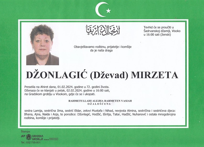 DŽONLAGIĆ (Dževad) MIRZETA 02.02.2024. godine u 16:00 sati 1. Februara 2024. DŽONLAGIĆ (Dževad) MIRZETA 02.02.2024. godine u 16:00 sati