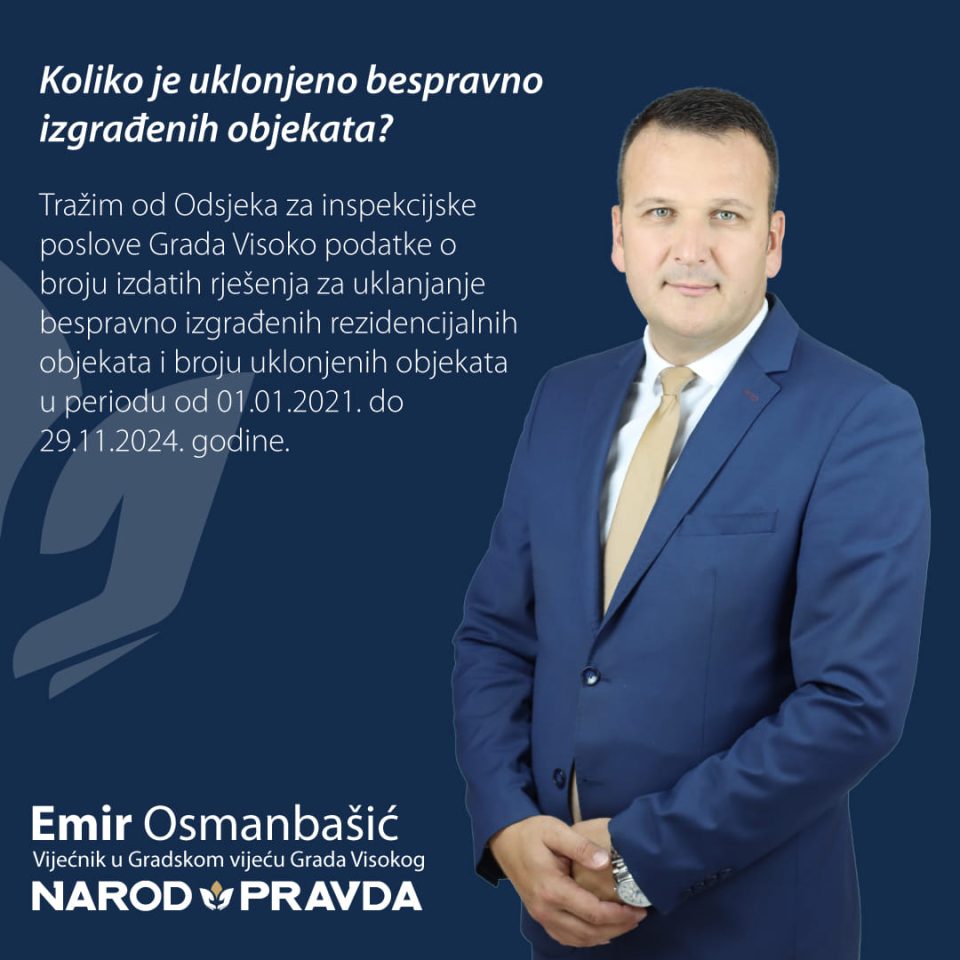 Odsjeku za inspekcijske poslove Grada Visoko na 2. sjednici Gradskog vijeća, uputili smo vijećničko pitanje: “Koliko je izdato Rješenja za uklanjanje bespravno izgrađenih objekata (rezidencijalnih objekata) i koliko je objekata uklonjeno u periodu od 01.01.2021. godine do 29.11.2024. godine.
