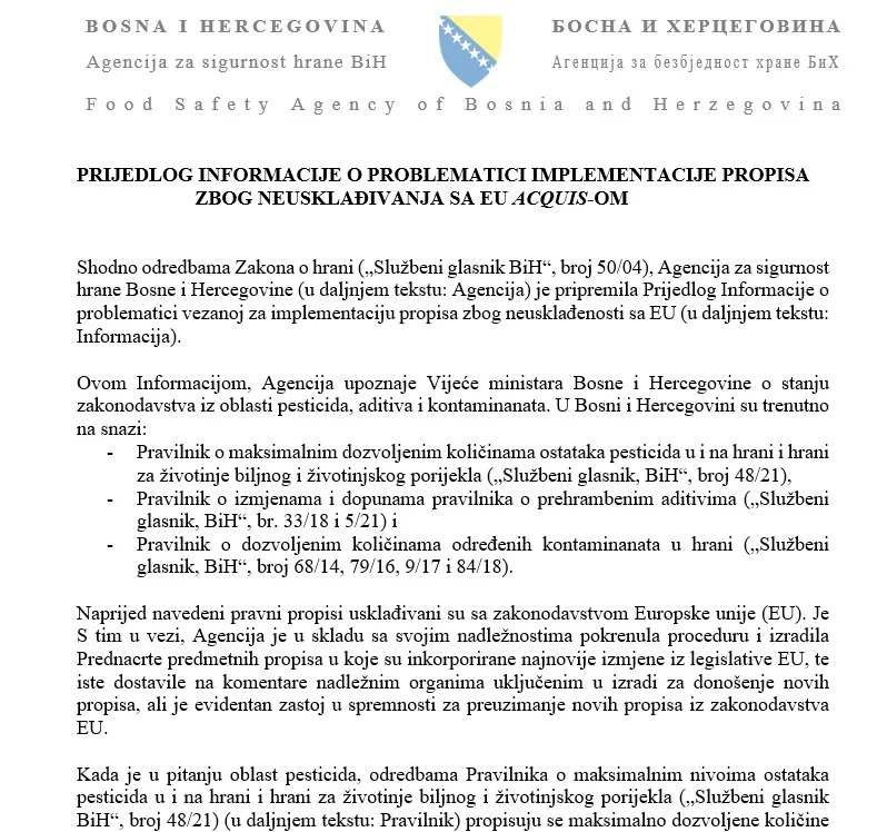 Kako su obrazložili u aktu odaslanom Vijeću ministara BiH, kada je riječ o pesticidima, aditivima i kontaminantima, trenutno su u BiH na snazi pravilnici o dozvoljenim količinama pesticida u hrani, zatim o prehrambenim aditivima i o dozvoljenoj količini kontaminanata u hrani.