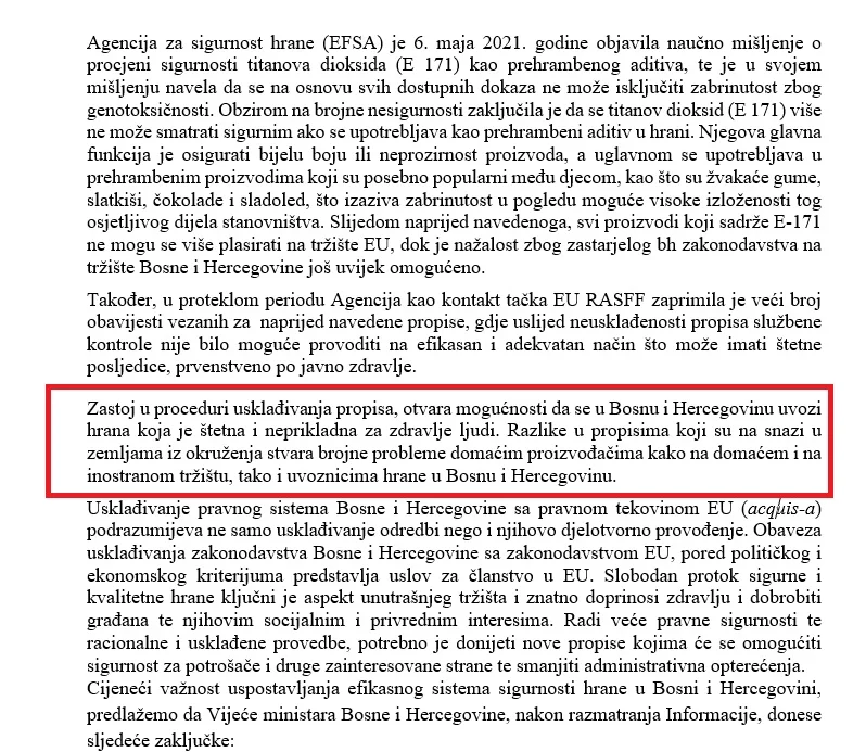 Agencija za sigurnost hrane Bosne i Hercegovine upozorila je Vijeće ministara BiH da zbog neusvajanja niza propisa Evropske unije (EU), na tržištu BiH ima hrane koja je štetna i neprikladna za zdravlje ljudi, saznaje Fokus.ba.