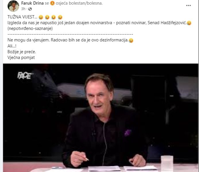 Tako je Drina u svojoj posljednjoj objavi na Facebooku objavio lažnu vijest o smrti Senada Hažifejzovića.