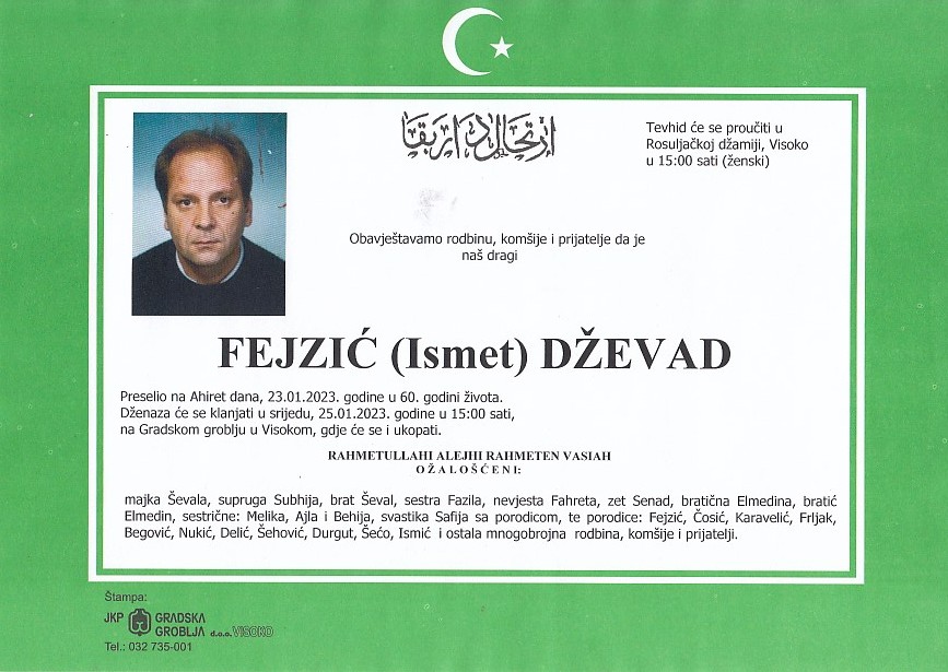 FEJZIĆ (Ismet) DŽEVAD 25.01.2023. godine u 15:00 sati 24. Januara 2023. FEJZIĆ (Ismet) DŽEVAD 25.01.2023. godine u 15:00 sati