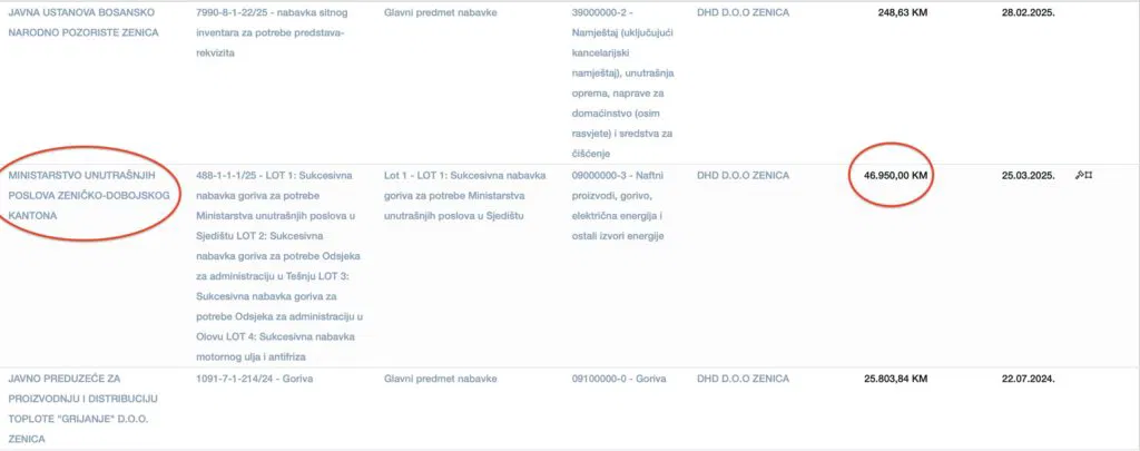 Firma DHD Zenica, prema podacima Portala javnih nabavki, prošle godine u julu od Javnog preduzeća „Grijanje“ Zenica dobilo je tender od 25.803 KM (bez PDV-a), također za nabavku goriva.