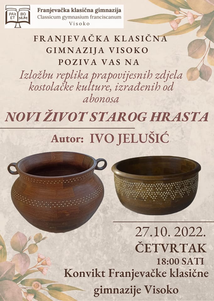 Konvikt Franjevačke klasične gimnazije u Visokom biće domaćin zanimljive izložbe koja će se održati u četvrtak, 27. oktobra ove godine sa početkom u 18 sati. U pitanju je izložba replika prapovijesnih zdjela kostolačke kulture, izrađenih od abonosa “Novi život starog hrasta”, a čiji je autor Ivo Jelušić. Iz FKG-a Visoko pozivaju sve zainteresovane da prisustvuju otvorenju izložbe.