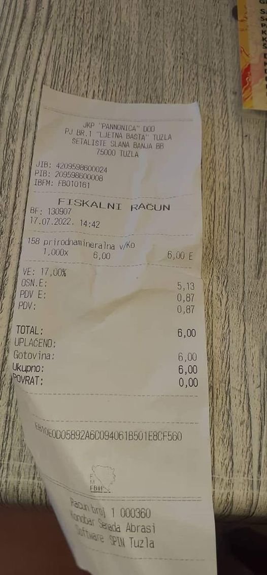 Tako jedan korisnik Twittera je pokazao račun za mineralnu vodu koja na Panonskim jezerima košta šest konvertibilnih maraka.