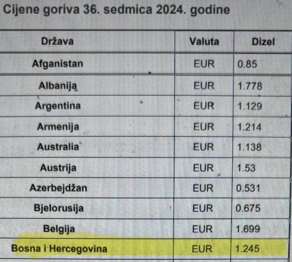 Ekonomista Draško Aćimović upozorio je na značajnu razliku u cijenama goriva u Bosni i Hercegovini u poređenju sa svjetskim berzama. Prema njegovim riječima, zvanični podaci za septembar 2023. i 2024. godine pokazuju da je gorivo u BiH skuplje za oko 15% nego što bi trebalo biti, s obzirom na kretanje cijena na globalnim tržištima.